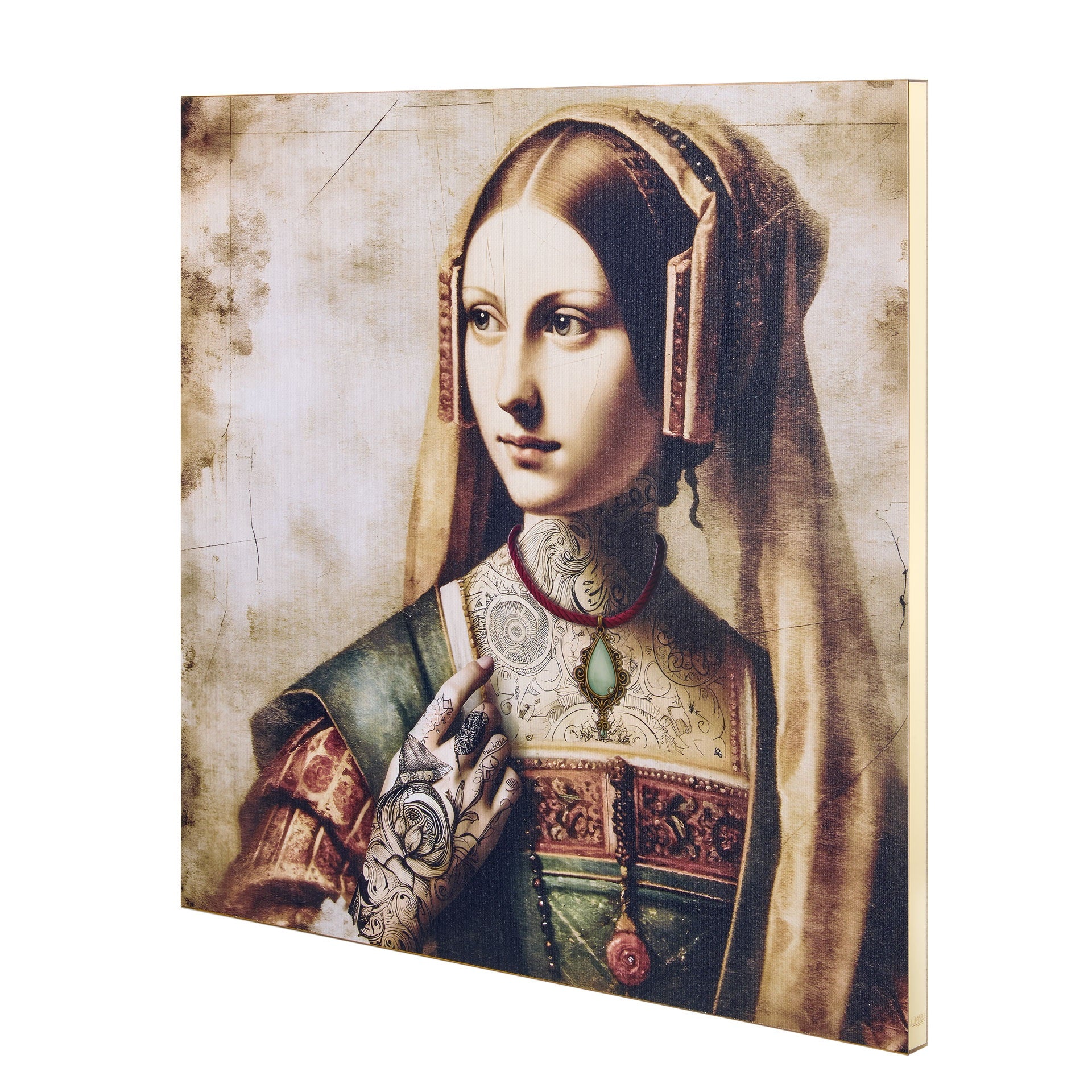 La collezione Old Frame reinterpreta il ritratto rinascimentale attraverso dettagli moderni e decorazioni ornamentali dal forte impatto visivo. Volti femminili senza tempo capaci di creare un perfetto equilibrio tra passato e presente. Grazie alla particolarità delle collane in rilievo, questi quadri offrono profondità, definizione e una resa cromatica di grande eleganza. Con dimensioni 49x49 cm, sono ideali per ambienti sofisticati e spazi living ricercati.